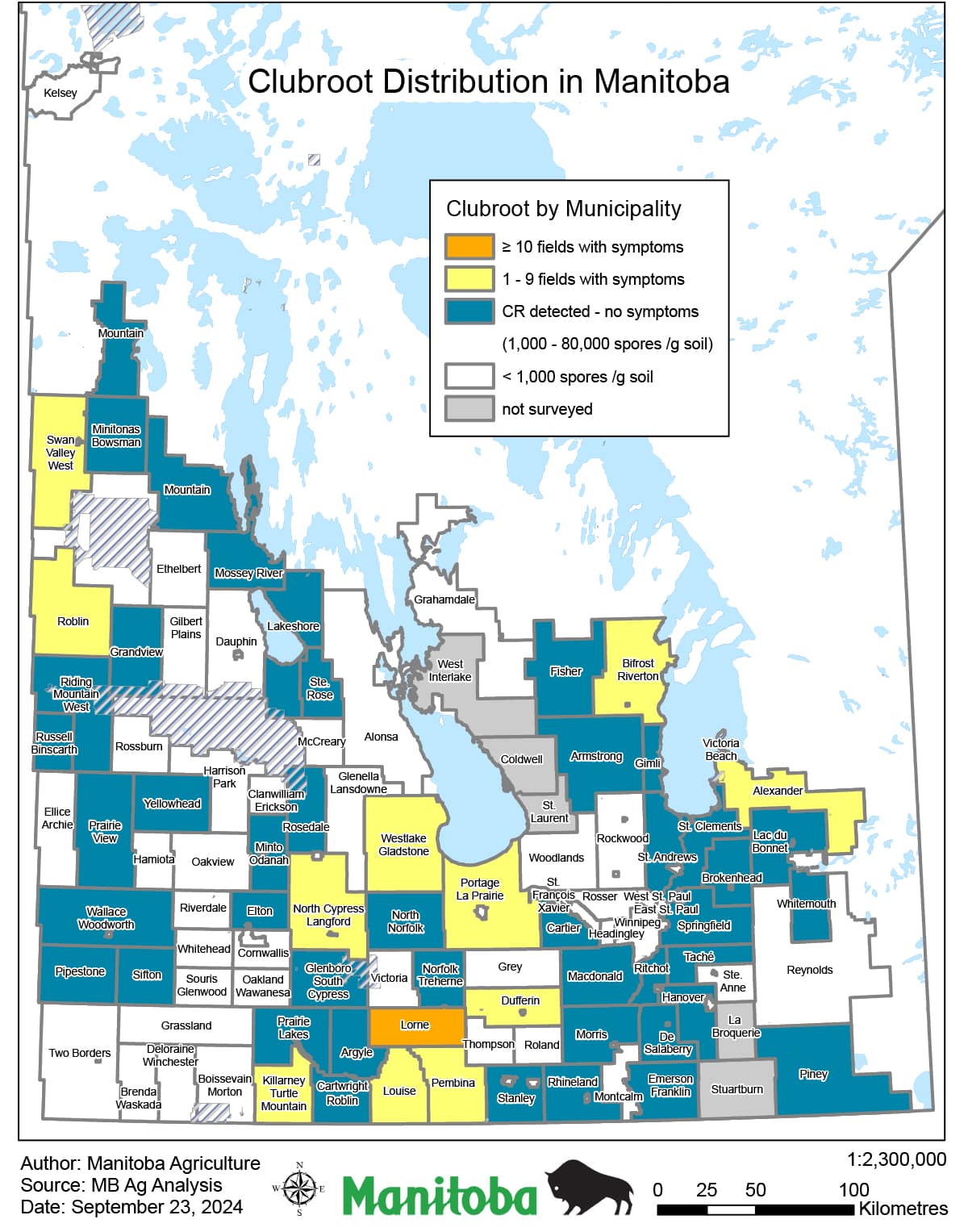 • Clubroot is a long-lived soil-borne disease that can impact canola performance. Using clubroot resistant varietes in Rural Municipalities where clubroot has been found is highly recommended as a risk mitigation tool. To know for sure if your own fields have clubroot, soil testing is the only way to find out prior to finding galls in the field. See page 59 for the map indicating clubroot distribution in Manitoba.